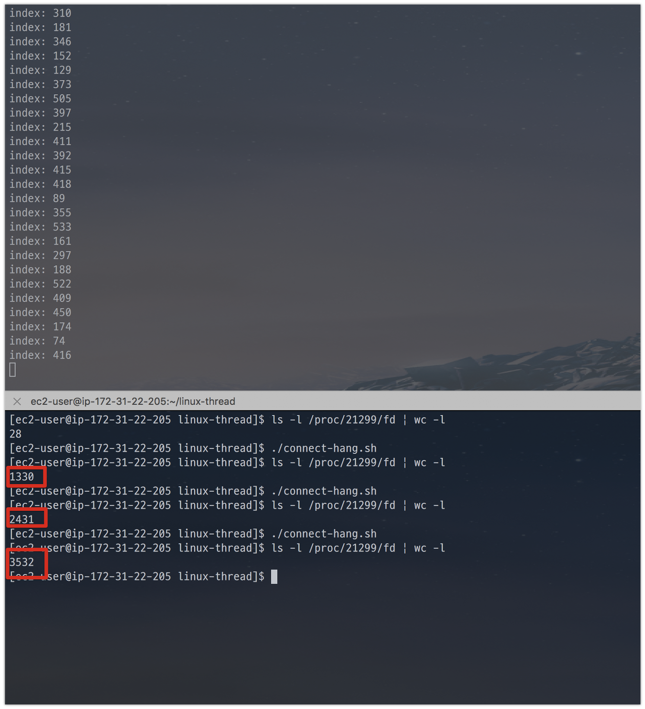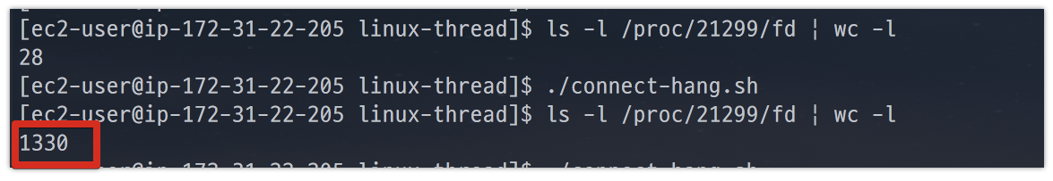 - 이를 계산하면서 하기가 애매하니, 1100개를 보내면 기본 open된 파일 + 추가 생성된 파일을 합쳐서 1024개가 넘어가는 시점에 에러가 발생한다는 계산입니다.