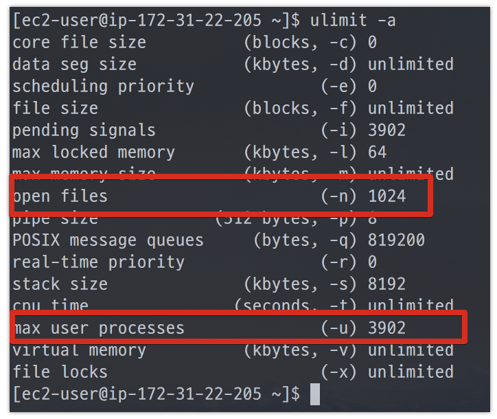t2.micro는 기본 설정이 open files가 1024, max user processes가 3902로 잡혀있다는 것을 알 수 있습니다.