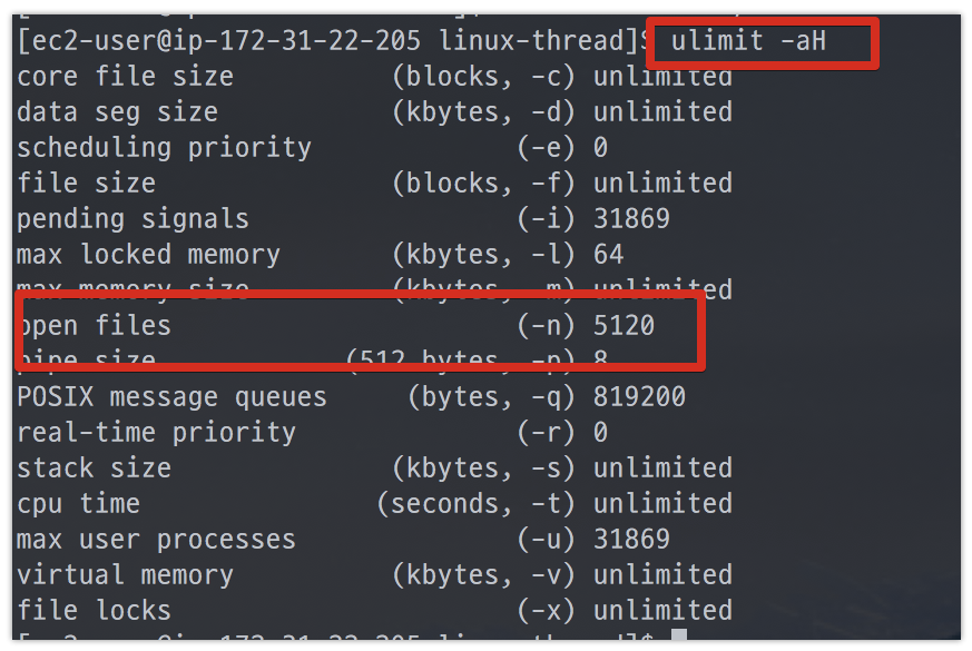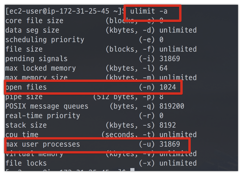t2.micro로 생성후 ulimit -a로 확인해보겠습니다.