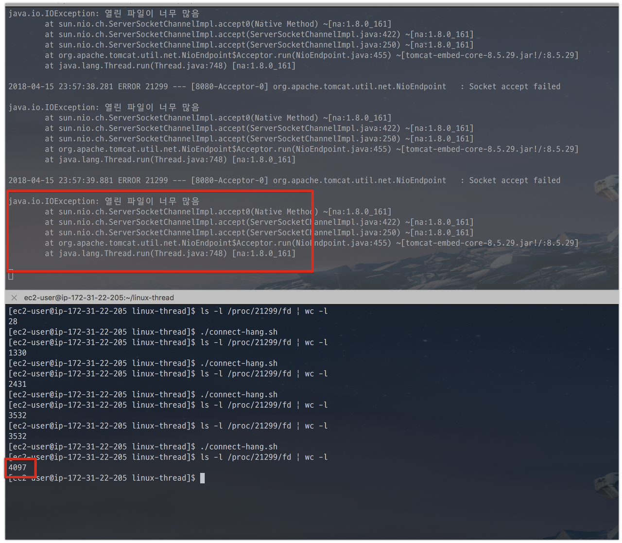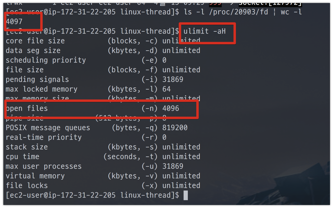 보시면 4097개까지만 열린채로 에러가 발생한 것을 알 수 있는데요.
