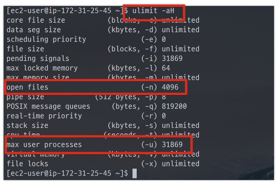 이를 통해 알 수 있는 것은, AWS EC2를 사용하실 경우 max user processes AWS 내부에서 인스턴스 사양에 맞게 적절한 값을 세팅해주니, 굳이 저희가 손댈필요는 없다는 것입니다.