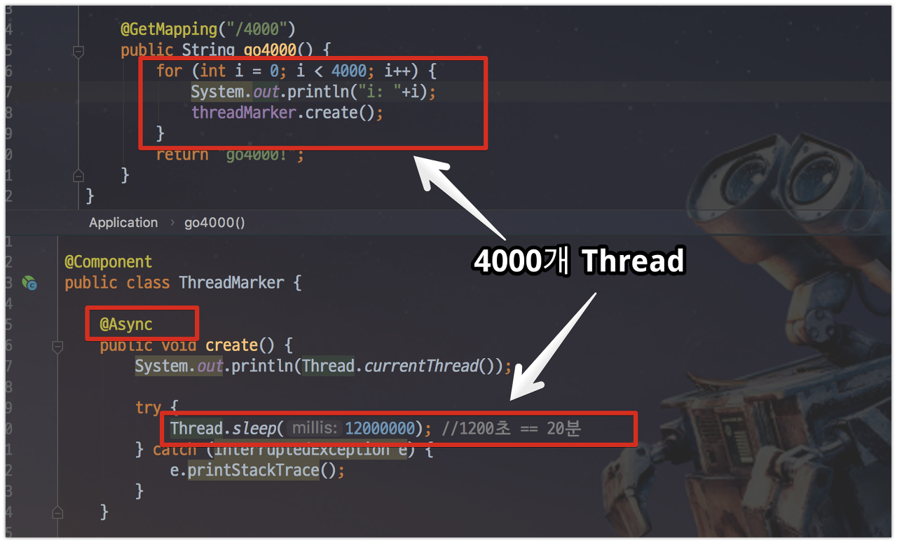 코드는 간단합니다. /4000으로 HTTP 요청이 오면 비동기로 4천개의 쓰레드를 동시에 생성하고, 20분간 유지합니다.