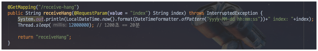- RestTemplate로 다른 서버로 API요청 (소켓 생성)을 보내고, 해당 서버에서는 20분간 응답을 대기 시킵니다.