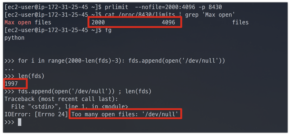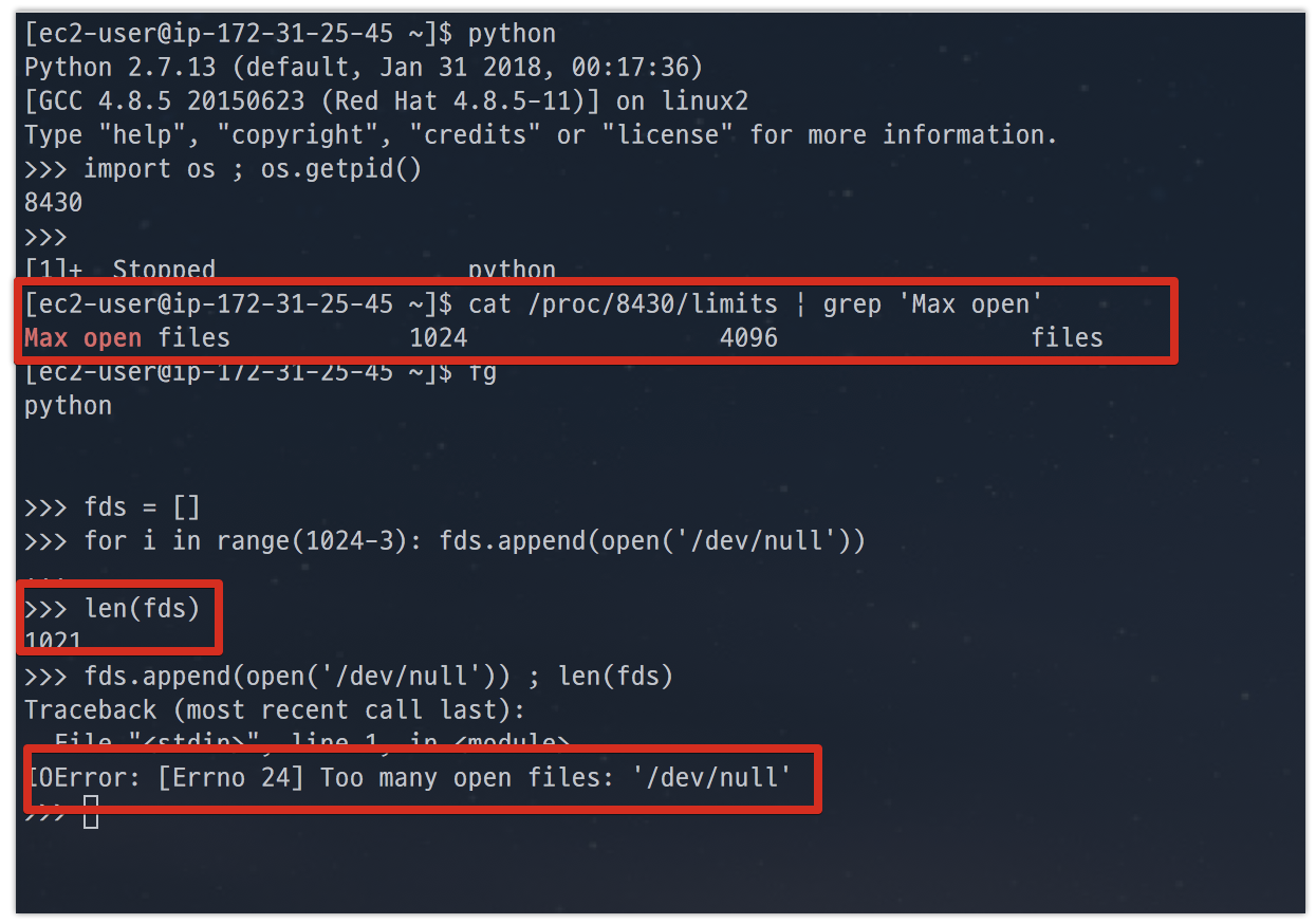 soft limit으로 1024, hard limit으로 4096인걸 확인하고, 파이썬 스크립트로 file을 임의로 열어봅니다.