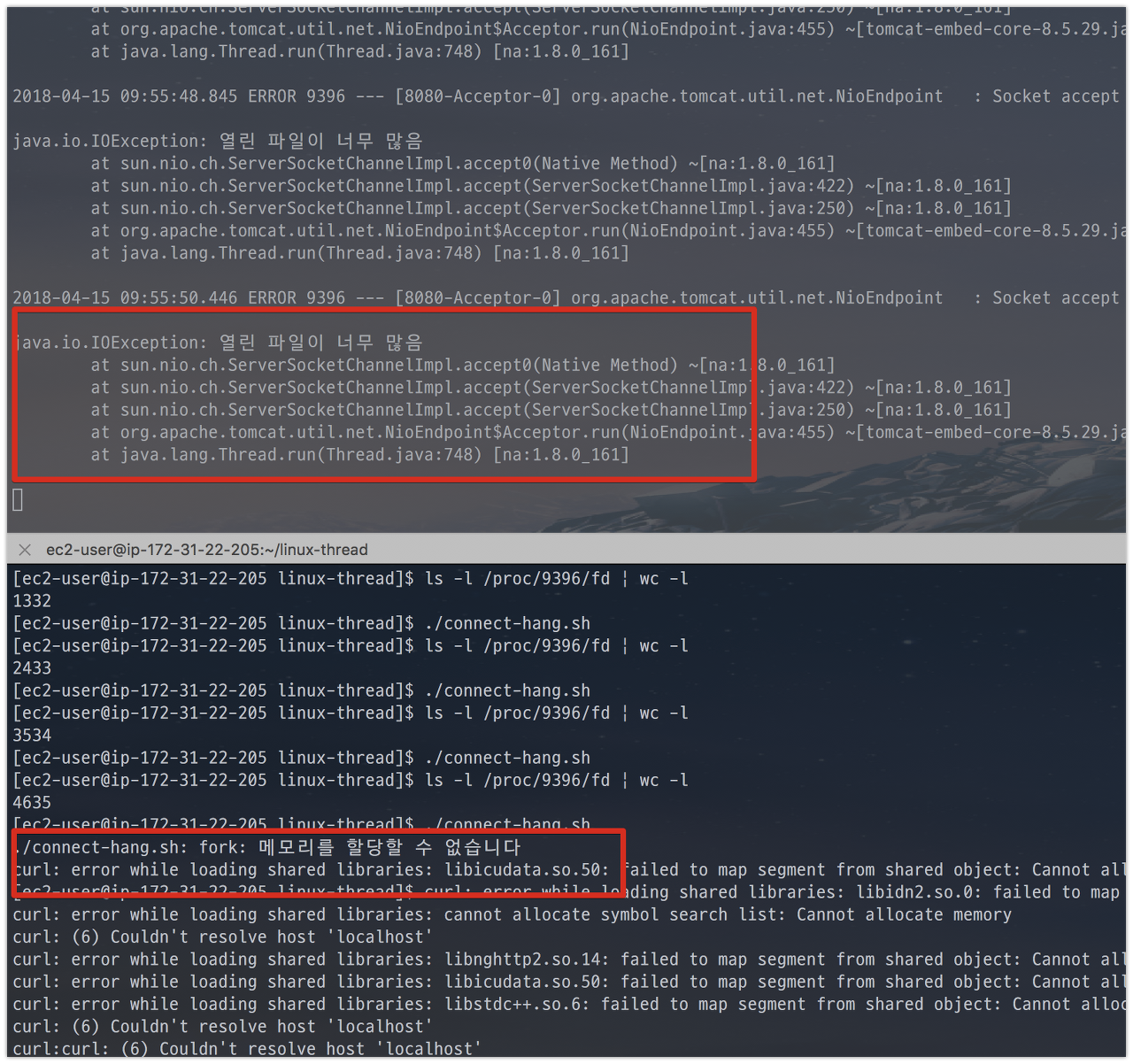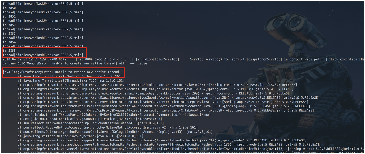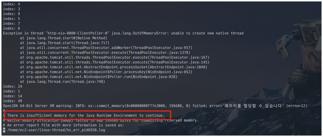 사진속을 보시면 3855번째에서 unable to create new native thread 에러 메세지가 발생했습니다.
